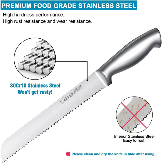 WALFOS Stainless Steel Serrated Bread Slice Knife Ultra-Sharp One-Piece Handle and 8-Inch Blade, Ideal for Slicing Bread, Bagels