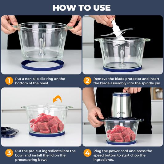 Bear Food Processor, Electric Food Chopper with 2 Glass Bowls (8 Cup+2.5 Cup), 400W Power Grinder with 2 Sets Stainless Steel Blades, 2 Speed for Meat, Vegetables, and Baby Food