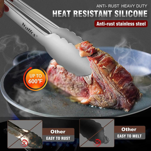 Upgrade your kitchen with the Walfos Food Tongs collection. These tongs are crafted from premium stainless steel and feature BPA-free silicone tips, ensuring they won't melt, rust, or flake. The heat-resistant design, up to 480°F, makes them perfect for grilling, cooking, and serving. Available in three sizes—7", 9", and 12"—these tongs cater to all your culinary needs, from flipping delicate fish to handling thick steaks.