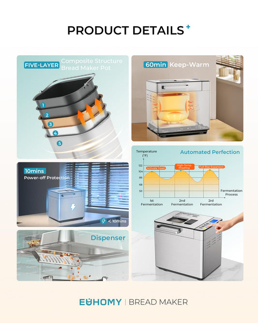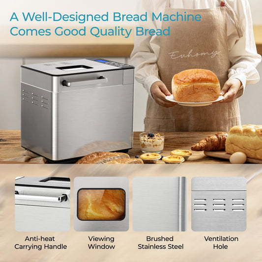 EUHOMY 25-in-1 Bread Maker Machine 2LB Breadmaker, Bread Machines with Nut Dispenser and Yeast Dispenser, 3 Loaf Sizes 3 Crust Colors, Dough Maker with Customized Options, Gluten-Free, Recipe, Gifts