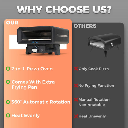 2-in-1 Gas Pizza Oven with Frying & Baking Functions - 12 Inch, Outdoor Pizza Oven with Auto-Rotating Stone and Frying Pan, Propane-Powered