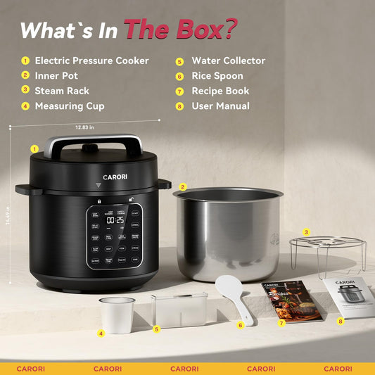 CARORI 9-in-1 Electric Pressure Cooker 6 Qt, Stainless Steel Inner Pot, Programmable 12 Multi-Function Cooker with Safe Vent Design, Rice Cook, Slow Cook, Sous Vide, Sauté, Warmer & Sterilizer, Black
