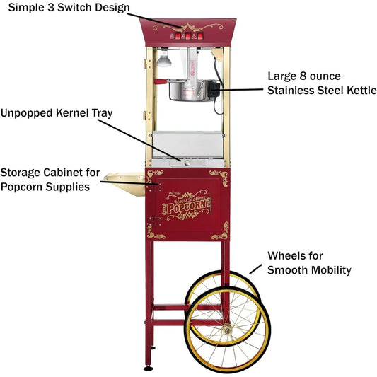 8 Ounce Antique Popcorn Machine and Cart, popcorn popper Red Movie style, With Stainless Steel and Tempered Glass Food Zones