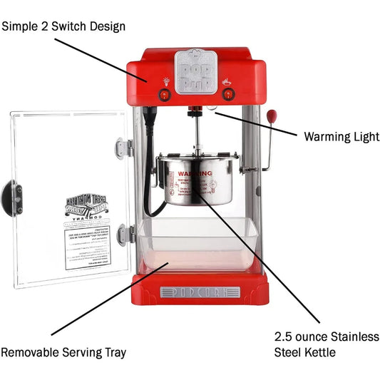 Pop Pup Countertop Popcorn Machine – Tabletop Popper Makes 1 Gallon – 2.5-Ounce Kettle, Catch Tray Warming Light & Scoop, Red