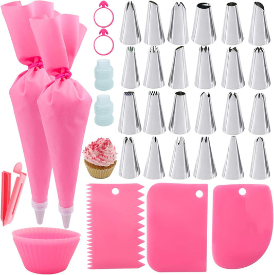 36Pcs Pink Piping Bags & Tips Set,24 Stainless Steel Nozzle Icing Tips With 2 Reusable Silicone Pastry Bag,Icing Smoother,Silicone Baking Cups,2Couplers Cake Decorating Tools Kit For Baking Decorating