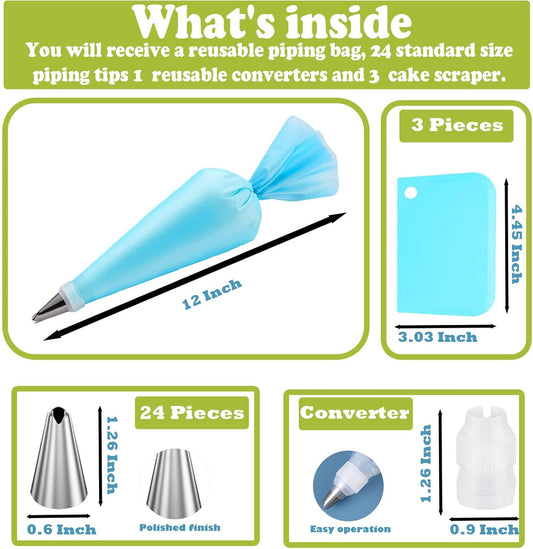 FANTEXY Piping Tips Set,29 Pieces Cake Decorating Supplies Kits with 24 Standard Piping Tips, 3 Scrapers,1 Converter,1 Reusable Pastry Bag, Stainless Steel Icing Nozzles for Cakes, Cupcakes, Cookies