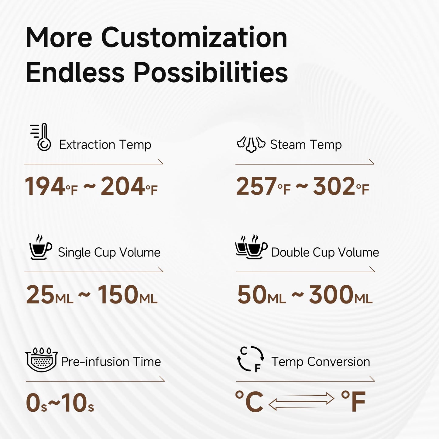 - Zakres opcjonalnego programu: pojedyncza filiżanka 25~150 ml, podwójna filiżanka 50~300 ml; zakres temperatury ekstrakcji na gorąco 90℃~95℃, zakres ekstrakcji na zimno 25℃; zakres temperatury pary: 125℃~150℃; zakres czasu wstępnej infuzji: 0~10 sekund; konwersja wyświetlanej temperatury: ℃ i ℉ można wzajemnie przeliczać.