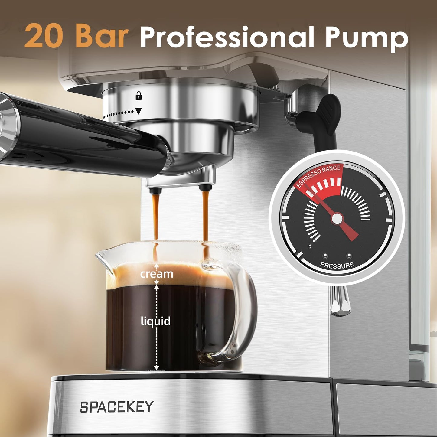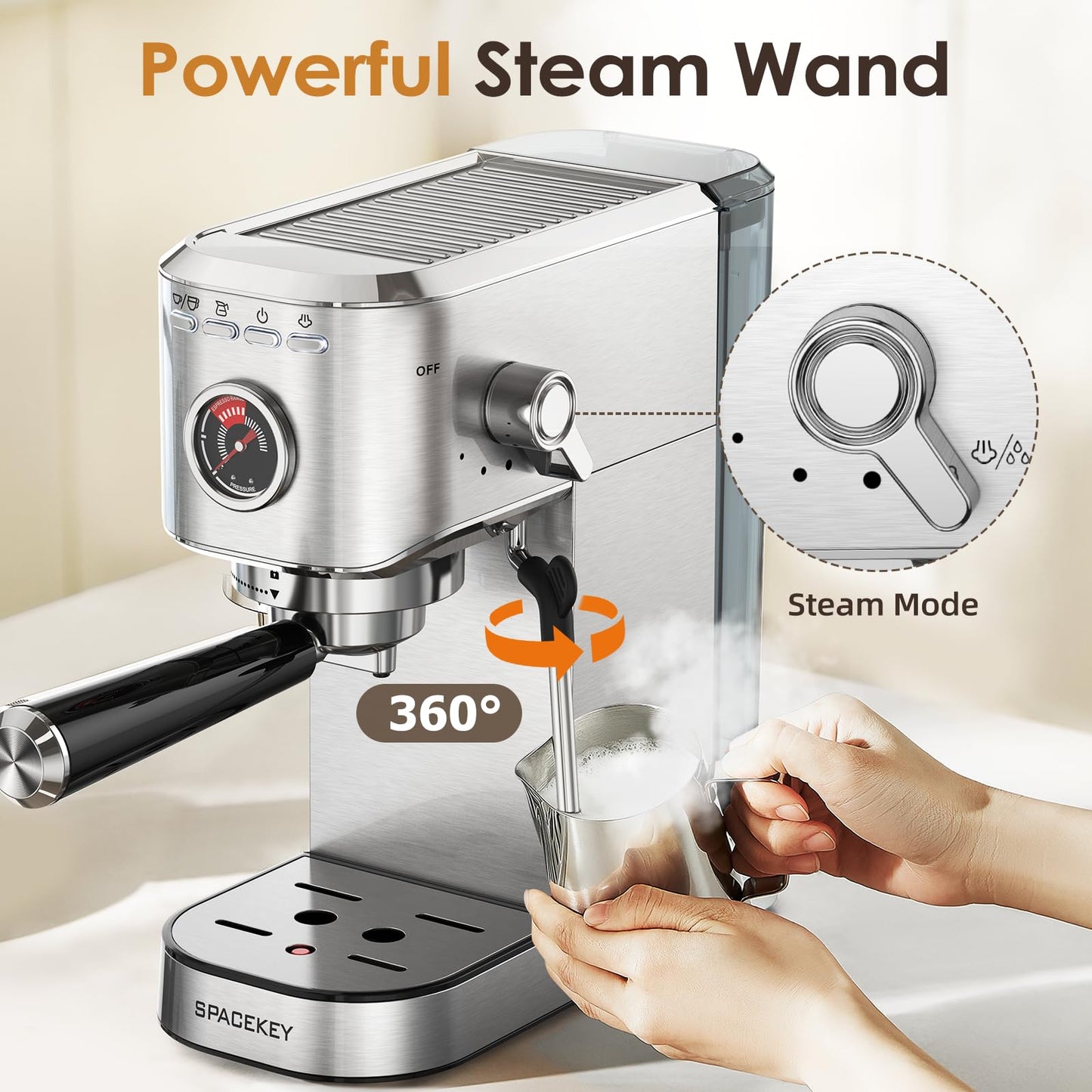 Ekspres do kawy Spacekey 20 barów, profesjonalny ekspres do kawy o mocy 1350 W ze spieniaczem do mleka, kompaktowy ekspres do cappuccino, latte i americano ze stali nierdzewnej z wyjmowanym zbiornikiem na wodę o pojemności 39 uncji, srebrny