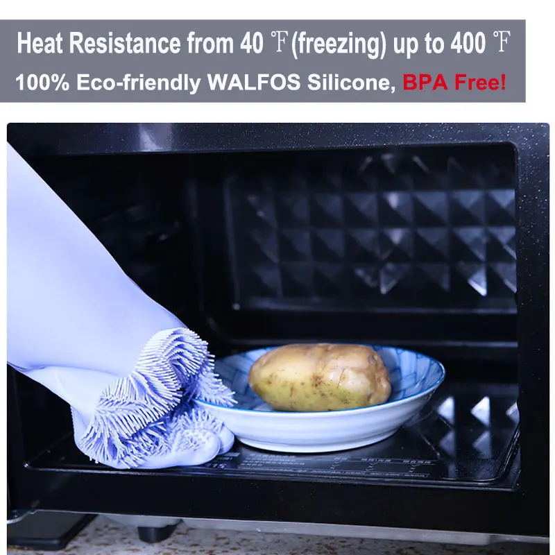 Wykonane z najwyższej jakości silikonu spożywczego, te rękawice są zbudowane tak, aby przetrwać. W przeciwieństwie do tradycyjnych gąbek, które szybko się zużywają, rękawice do szorowania Walfos są zaprojektowane tak, aby wytrzymać rygorystyczne czyszczenie bez utraty kształtu lub skuteczności. Są odporne na temperaturę do 160°C (320°F), co czyni je idealnymi do obsługi gorących naczyń i przyborów kuchennych bezpośrednio po wyjęciu z piekarnika. Ponadto ich przyjazna dla środowiska konstrukcja bez BPA zapewnia, że są bezpieczne zarówno dla Ciebie, jak i dla środowiska.