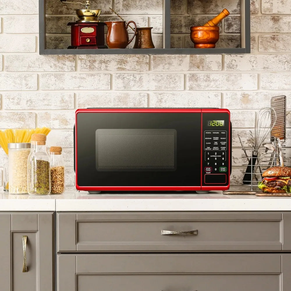 The 0.7 Cu ft 700-Watt Compact Countertop Microwave Oven is available in three colors including Black, Red or White. Each color is designed to complement your kitchen, dorm room, office or rec room. Features include LED display, kitchen timer and clock, six convenient quick-set menu buttons, 10 different power levels for cooking a variety of foods, child safety lockout, weight and time defrost and a 30 second one-touch option. The 0.7 Cu ft 700-Watt Compact Countertop Microwave Oven is the perfect addition to any home.