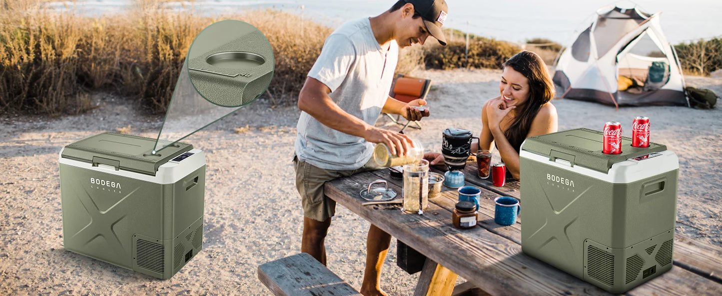 - 【USER FRIENDLY DESIGN】Car cooler is equipped with detachable 2-way lid and it can be easily disassembled. This allows you to switch the direction of the door to suit your needs, making it more convenient for you to access your drinks or food while driving. Our travel fridge includes USB slot for phone charging while on the go, and cup slots design can prevent water from spilling, which so amazing and perfect for outdoor activities! Great partner for you to take on your travels!