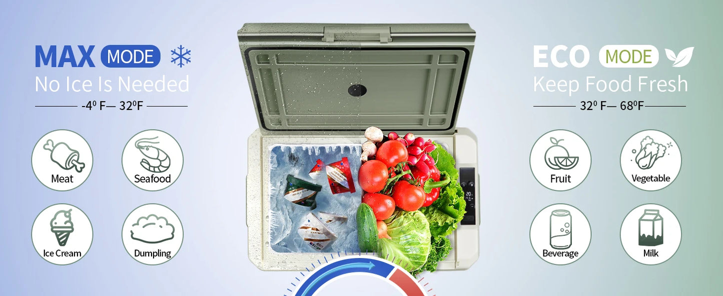 - 【FAST COOLING AND APP CONTROL】Car fridge support WIFI APP connection, you can control the temperature range and set the mode conveniently via mobile APP, and easy to check the temps and the status at any time. The car fridge can achieve 15-minute fast cooling from 68℉ to 32℉, making it ideal for quickly cooling down drinks. It can be used as both a freezer or a refrigerator, no ice is needed, keeping ice cream frozen and storing fresh food. Both temperature ranges from -4℉ to 68℉.