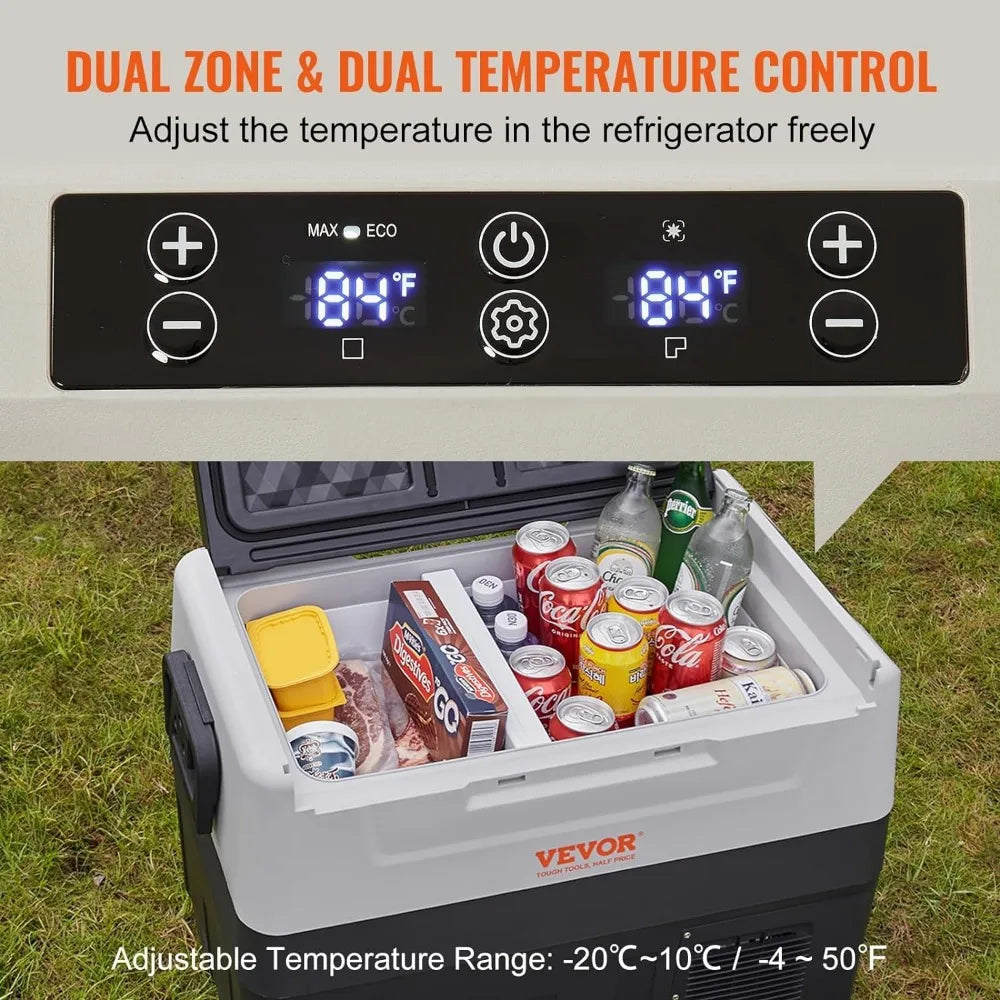 - Dual-Zone Temperature Control: The two zones can be customized for insulation or refrigeration purposes, and the temperature can be adjusted between -4°F to 50°F to suit your specific needs. With a generous total capacity of 58QT, you can easily refrigerate and store an assortment of beverages, fruits, meats, seafood, and more, ensuring you have everything you need for your daily adventures.