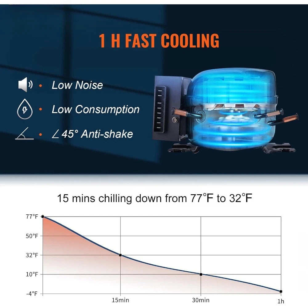 - Rapid Cooling: Experience quick and efficient cooling with our mini car fridge. Equipped with an upgraded compressor, it can cool from 77°F to 32°F in just 15 mins, and cool to -4℉ in one hour, ensuring your beverages and food stay refreshingly chilled. It even performs flawlessly at a 45° inclination, making it the perfect companion for outdoor adventures or work on the go.
