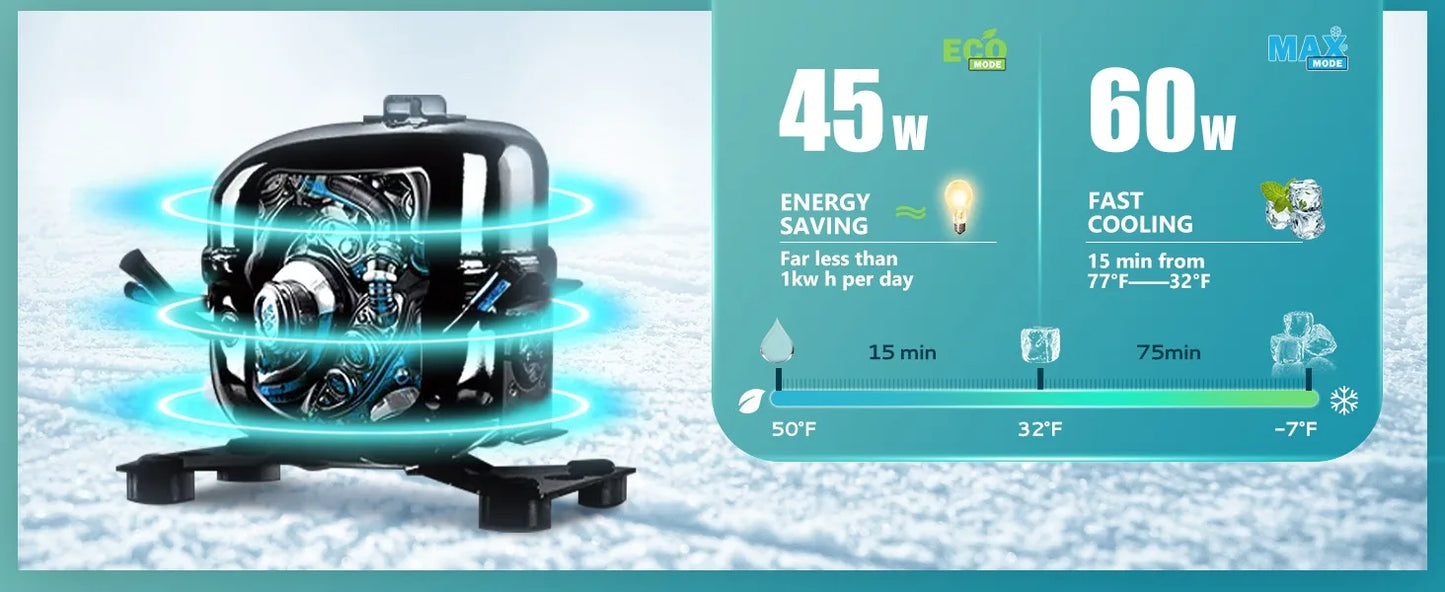 - HIGH EFFICIENCY&LOW ENERGY CONSUMPTION - 12 volt freezer adopts advanced 3D refrigeration technology and is equipped with a powerful compressor for fast cooling. Our 12v freezer has UL energy-saving certification, which consumes very low energy. You could choose ECO mode for energy-saving or MAX mode for fast cooling.Our car portable fridge average energy consumption is only 45W, which is equivalent to the power consumption of a car navigator.This will benefit your wallet.