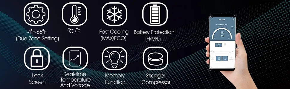 App Control1.Download "Car fridge freezer"from App Store or Google Play. 2.Connect Refrigerator via Bluetooth. 3.Control your Refrigerator with your Phone. |