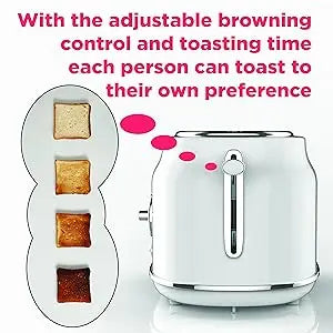 Adjustable Browning SettingsWith this option, you can toast your bread to the precise browning you like. Different baking times are indicated by different settings. Each gear has a ten-second deviation. Settings 1-2: Light shade of toast. Settings 3-4: Brown shade of toast. Setting 5: Dark shade of toast. |