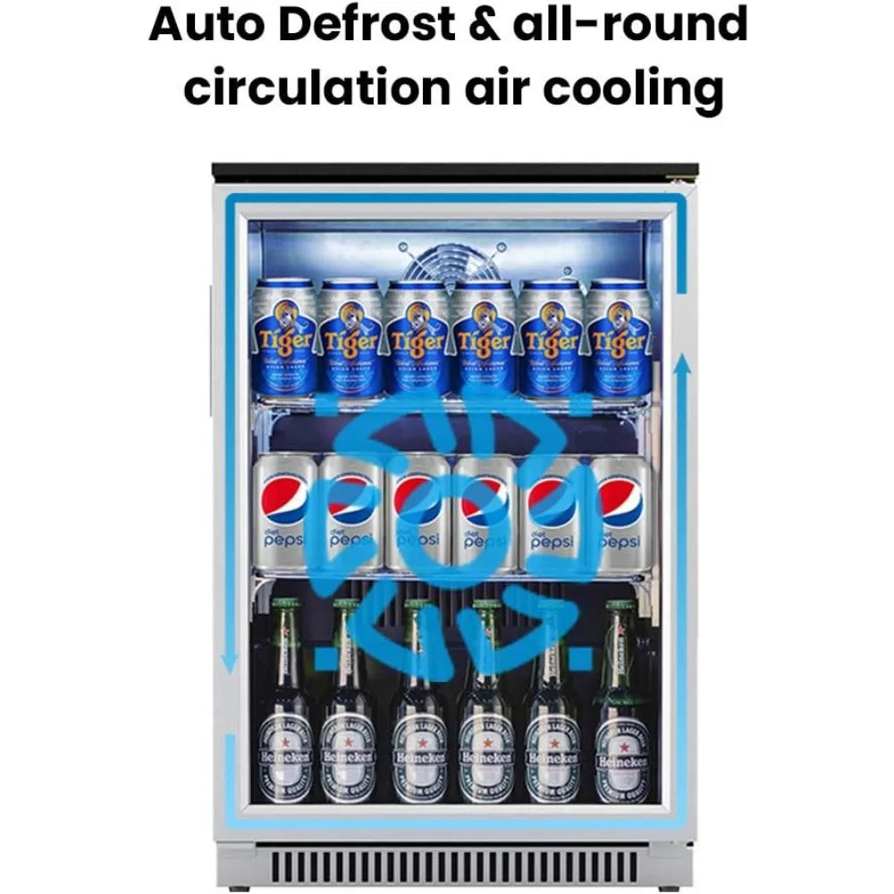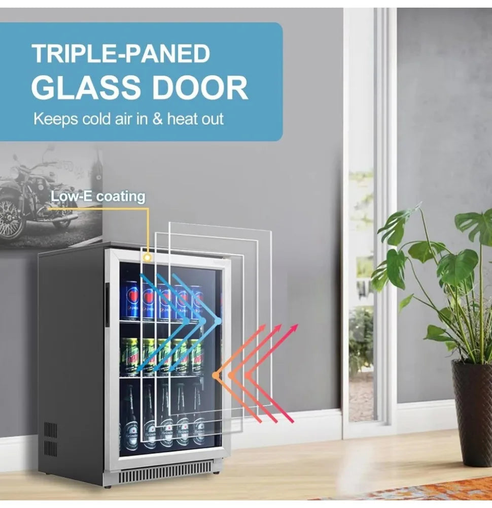 - Sleek Design with LED Lighting: Stainless steel frame, fog-free triple-layer glass door and sturdy construction. The blue LED lighting enhances visual appeal and creates an inviting atmosphere.