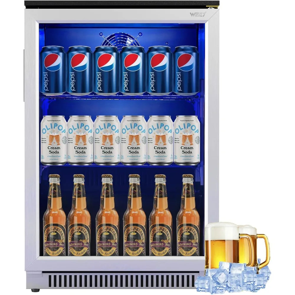 20 Inch Beverage Fridge with Glass Door, 120 Can Mini Fridge with Blue LED Light for Beer, 36-50°F Under Cooler, Auto Defrost