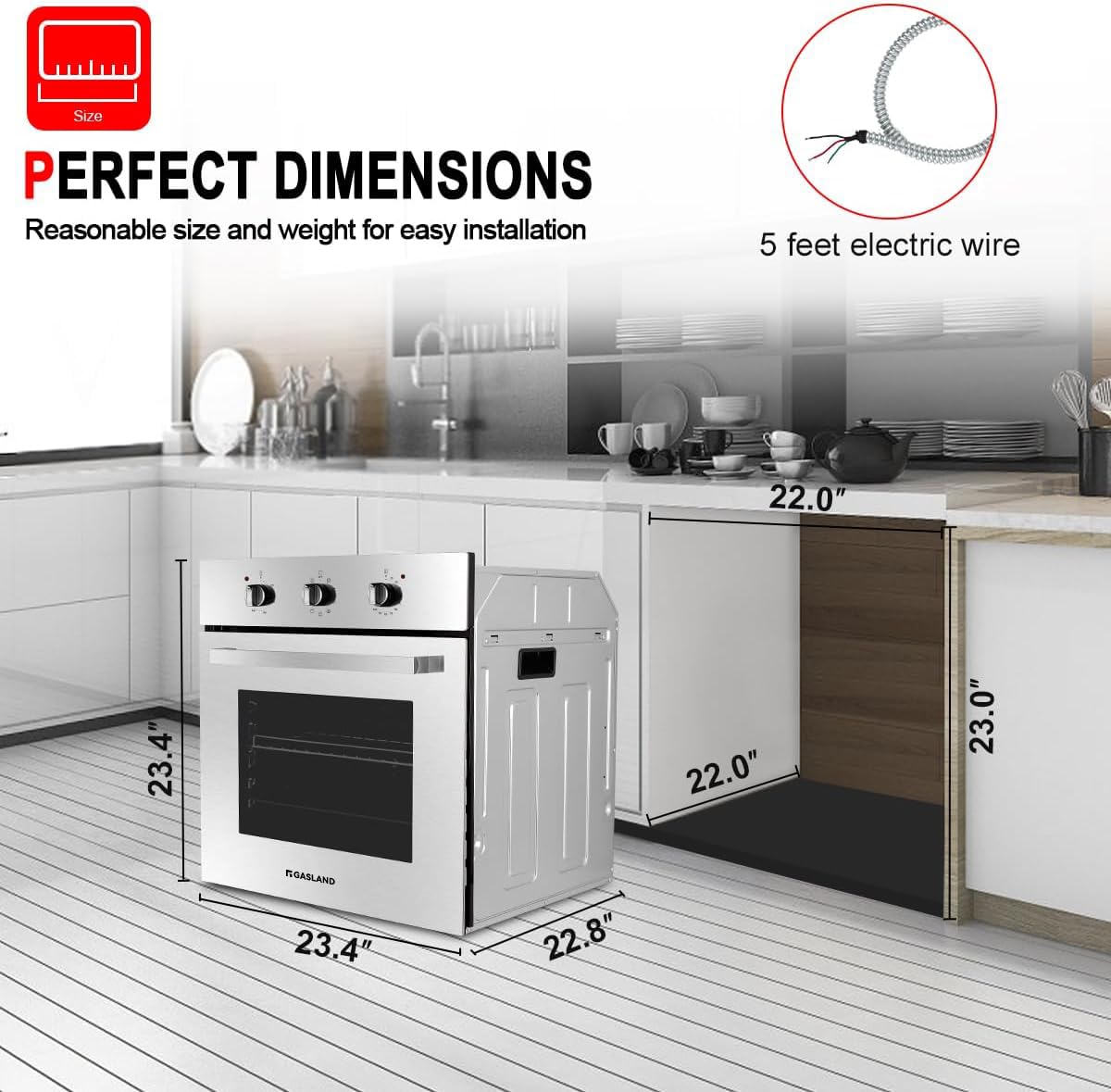 - 【Excellent after-sales service】We support 1-year warranty, lifelong technical support, and 24-hour premium service for this electric oven. If you have any issue about our oven, please don't hesitate to contact us. Please confirm the Gasland oven size: 23.4"x23.4"x22.6" and built-in size:22.0"x23.0"x22.0". It can match your kitchen perfectly. Upgraded manual for easy installation.