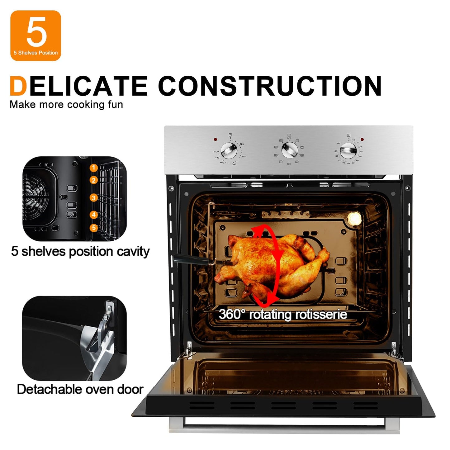 24 Inch Electric Oven, Built-in Single Wall Oven GASLAND ES609MSN, 240V 3200W 2.3Cu.ft Convection Oven with Rotisserie, 9 Cooking Modes, Mechanical Knob Control, Transparent Window, Stainless