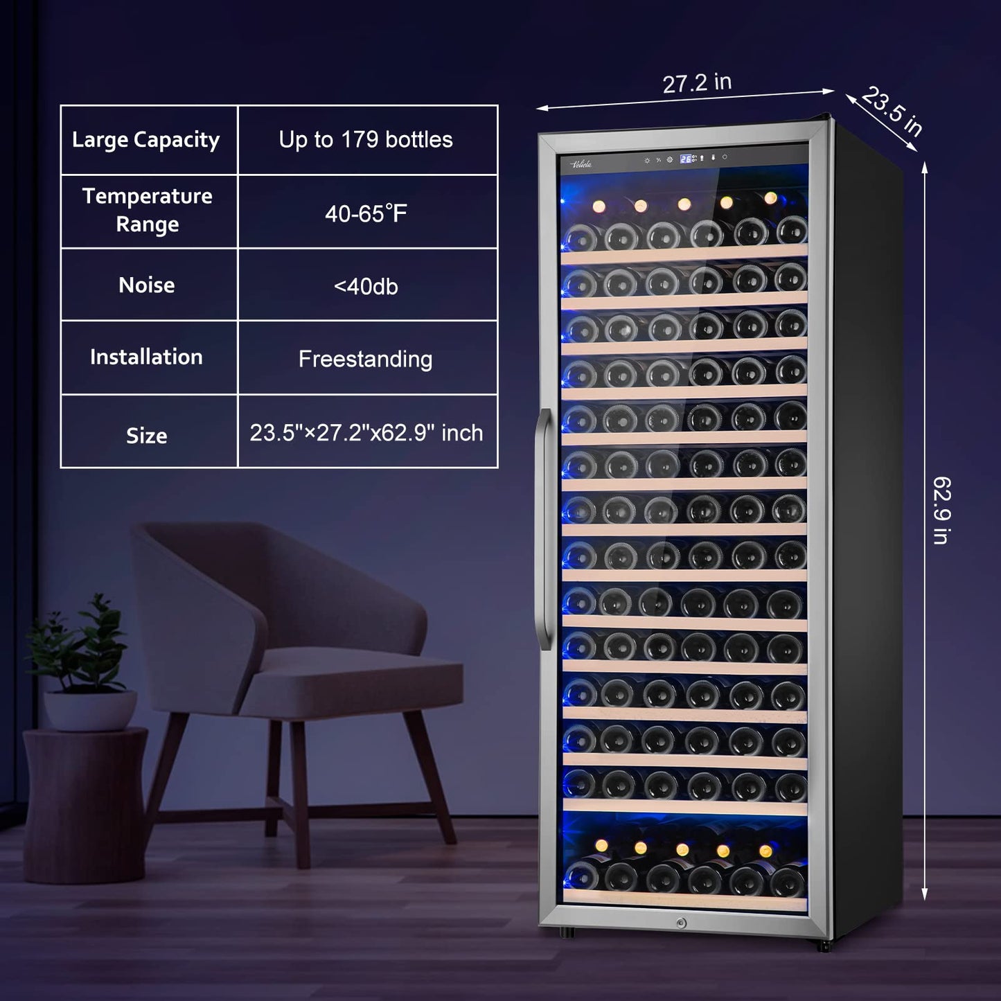 - 【 179 Bottles Large Capacity 】The 24'' wine chiller has an extraordinarily large storage space that can hold up to 179 different size bottles of your favorite wine. Keep your wine collection perfectly organized and properly alive.