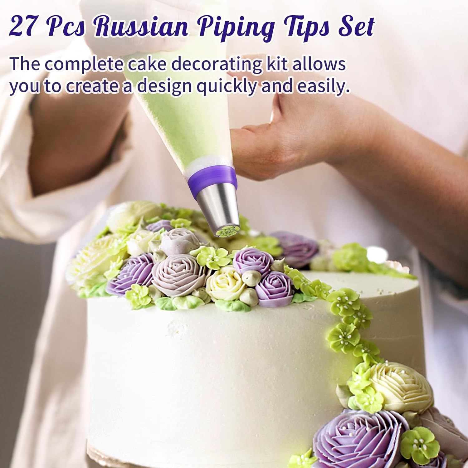 27-Piece Russian Piping Tips Set - Icing Bags and Tips Set Cake Decorating(12 Icing Tips 10 Pastry Baking Bags 2 Leaf Piping Tips 2 Couplers 1 Silicone Bag)