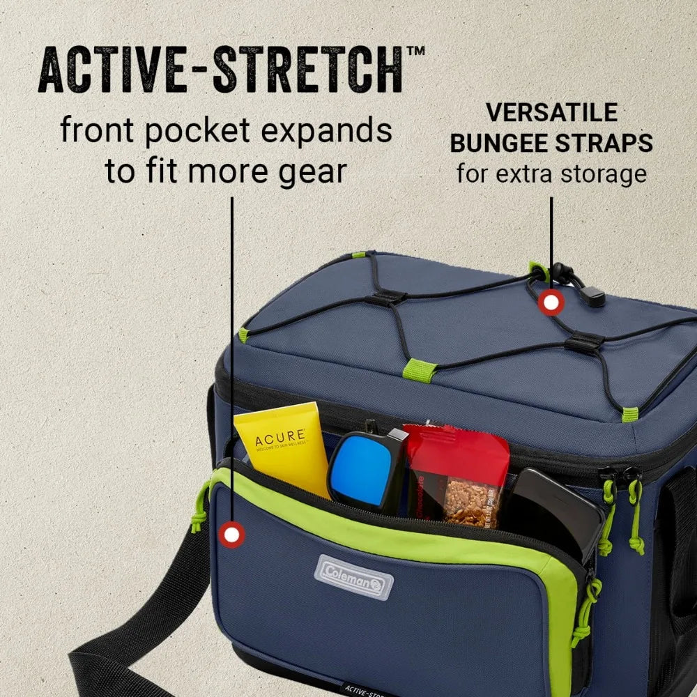 The 30 cans Soft Cooler, 13.8" x 11" x 12.9", Spider Mum Blue is the perfect cooler for you on the sidelines, at the park, or at the beach. The Canvas Active-Stretch™ front pocket expands to fit all your gear like your phone, keys, or snacks, and the 4Way stretch side mesh pocket easily fits a water bottle. The padded top handle lets you carry the cooler comfortably even when packed to the brim. Food and drinks stay cold up to 24 hours, and the antimicrobial leakproof liner helps prevent odor, mildew, and mold from forming.