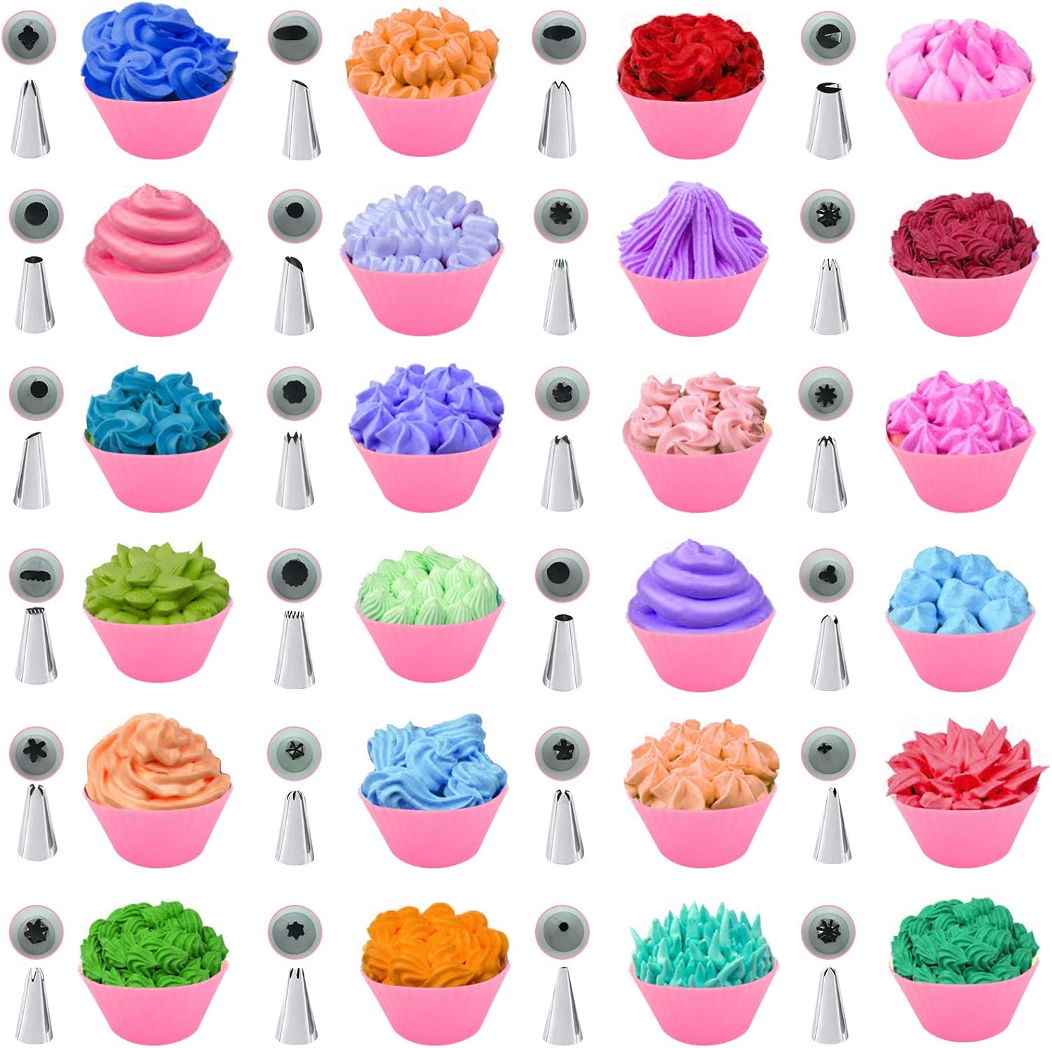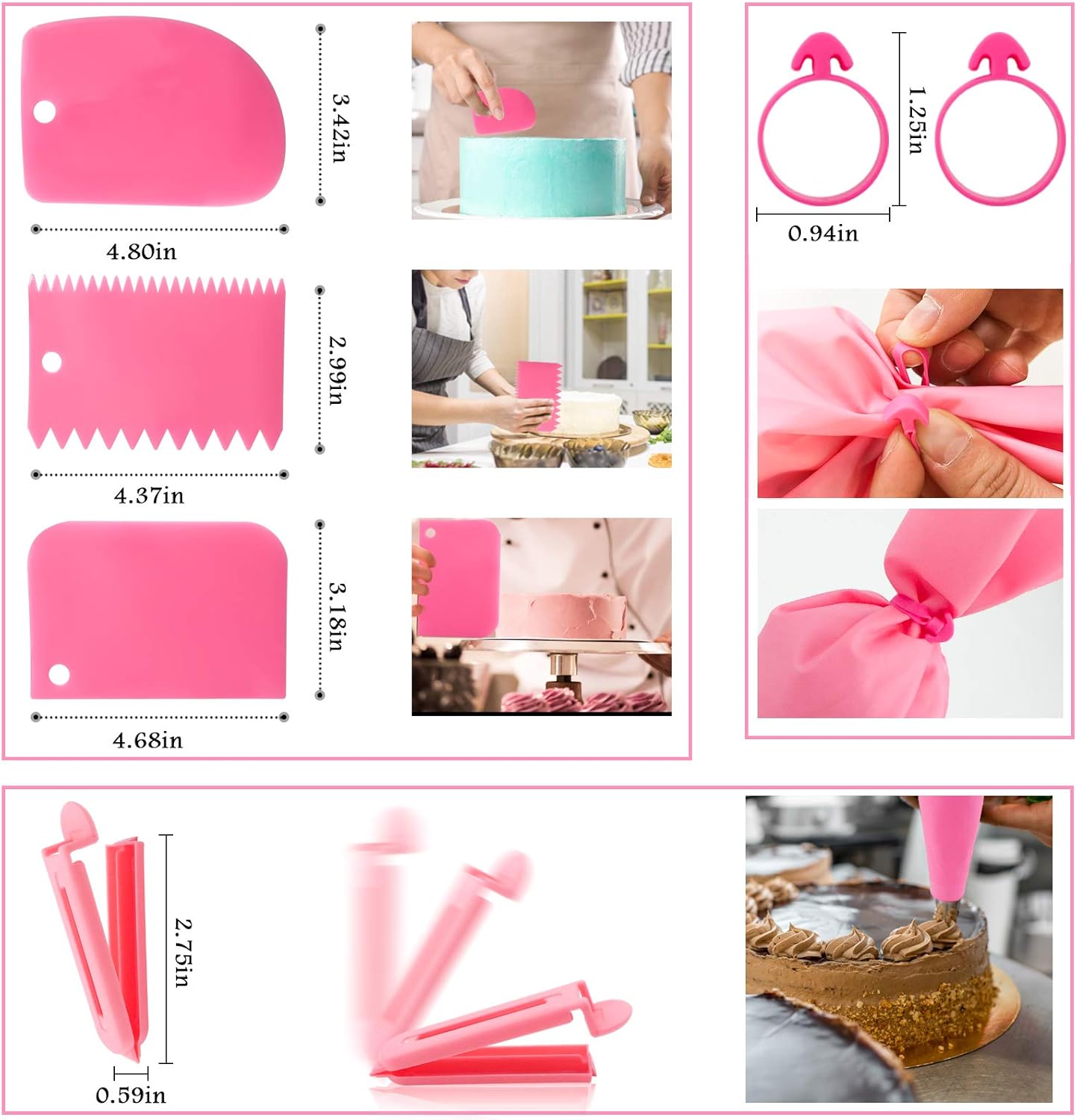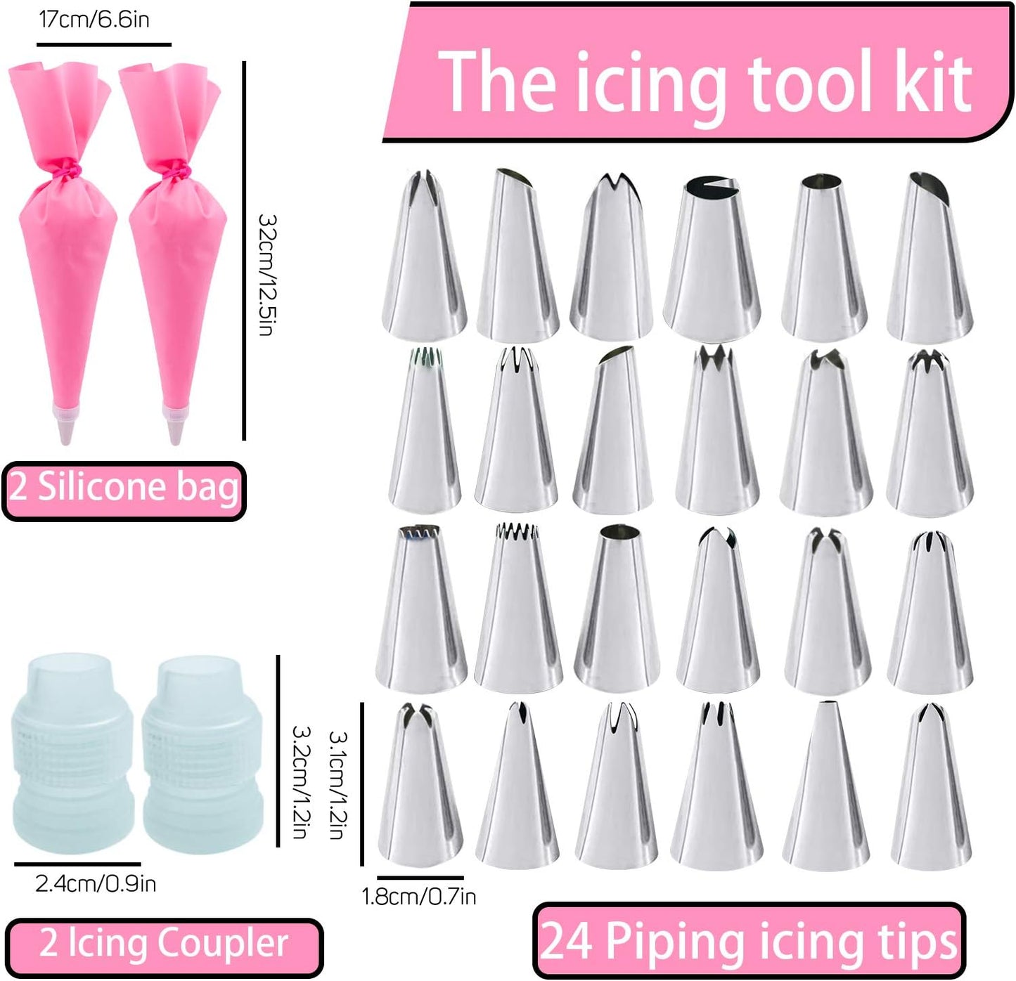 - 🎂🍰 PERFECT CAKE DECORATING SUPPLIES KITS: 24 x stainless steel icing tips, 2 x silicone pastry bags, 2 x reusable coupler, 3 x Plastic spatulas,2 x reusable silicone baking cups, 2 x frosting bags ties and 1 x Bag Clips. Provide you a full, fast, simple and necessary cake decorating tools set for your baking decoration.