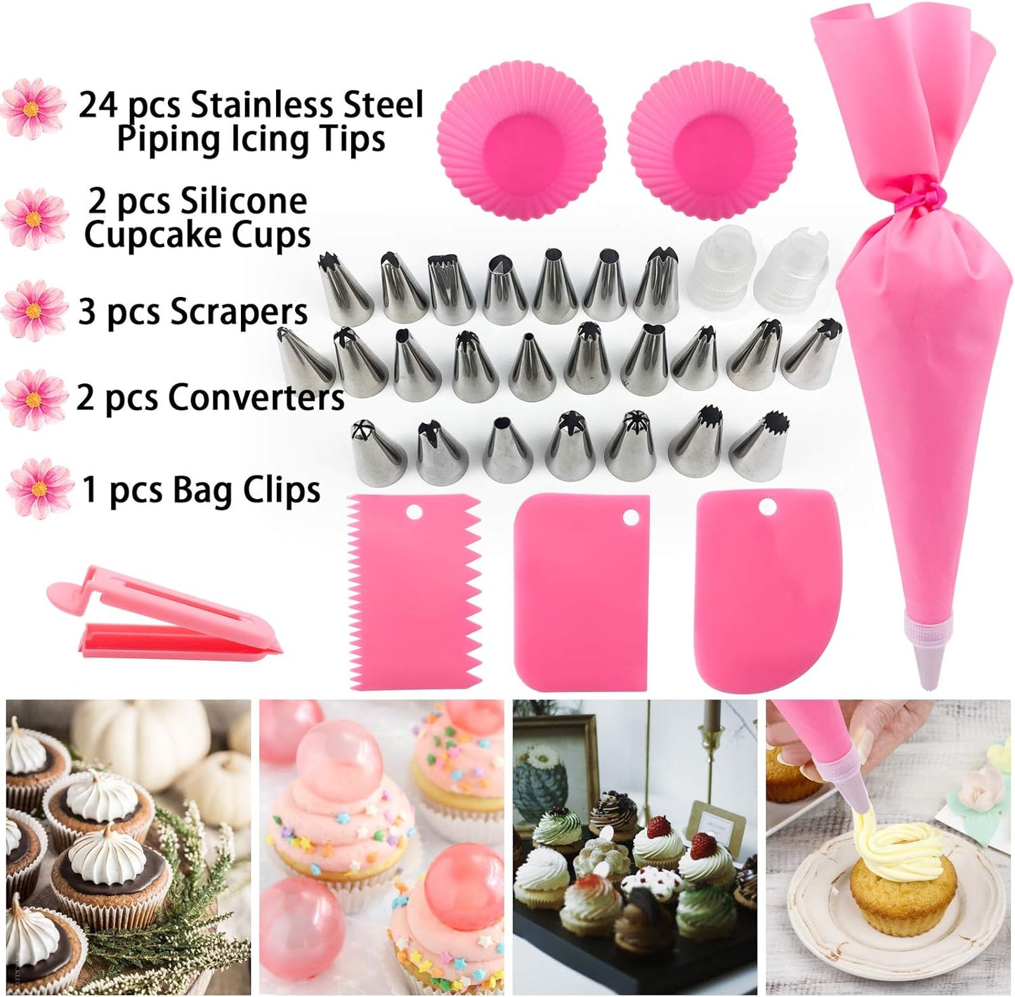 36Pcs Pink Piping Bags & Tips Set,24 Stainless Steel Nozzle Icing Tips With 2 Reusable Silicone Pastry Bag,Icing Smoother,Silicone Baking Cups,2Couplers Cake Decorating Tools Kit For Baking Decorating