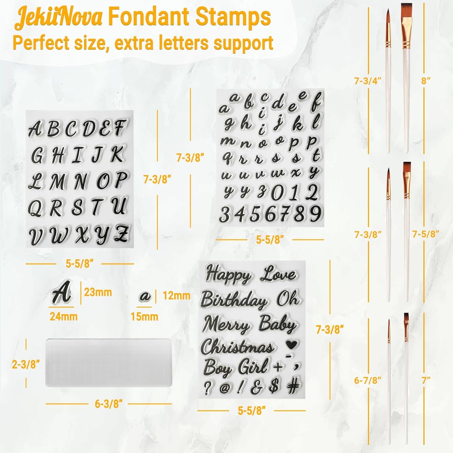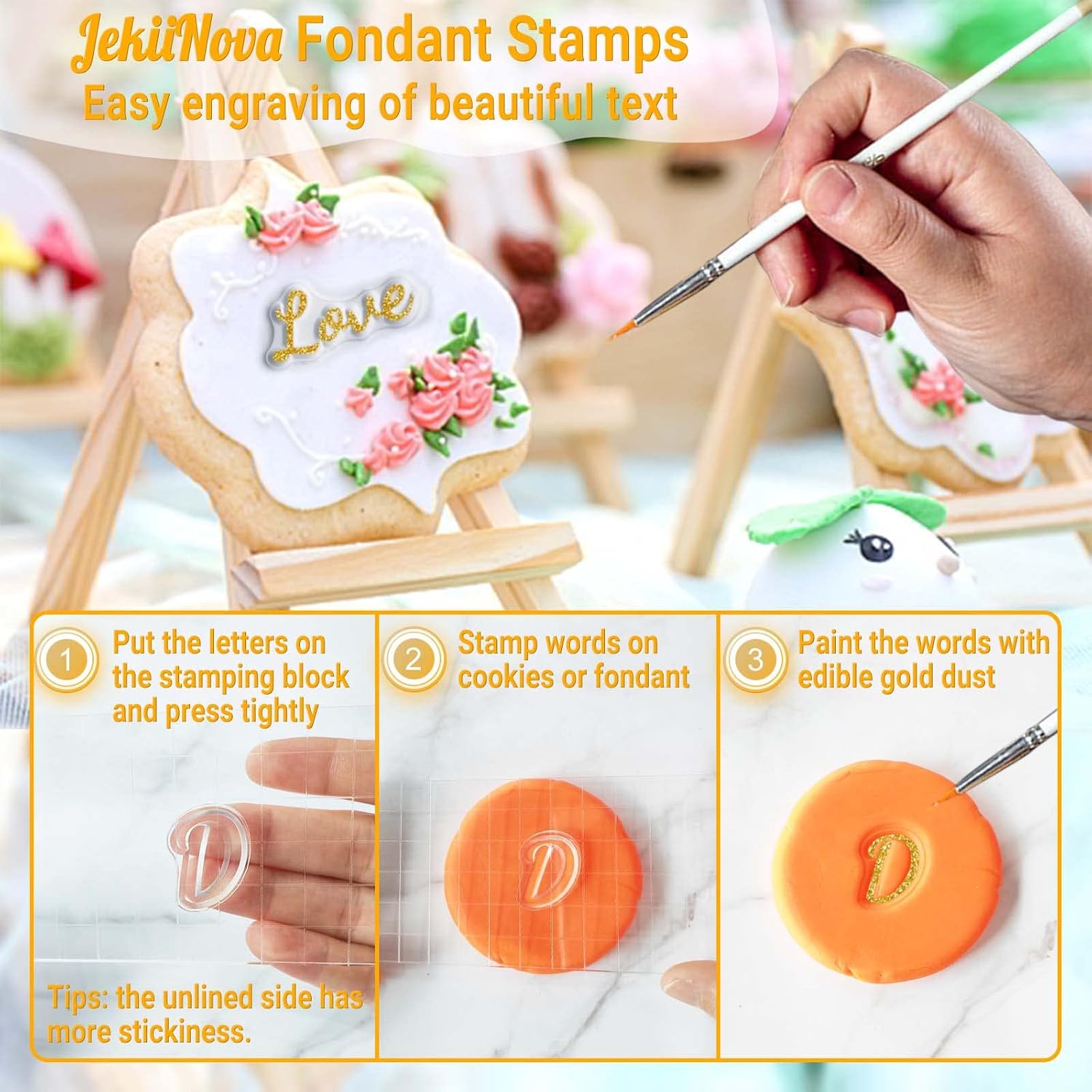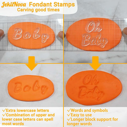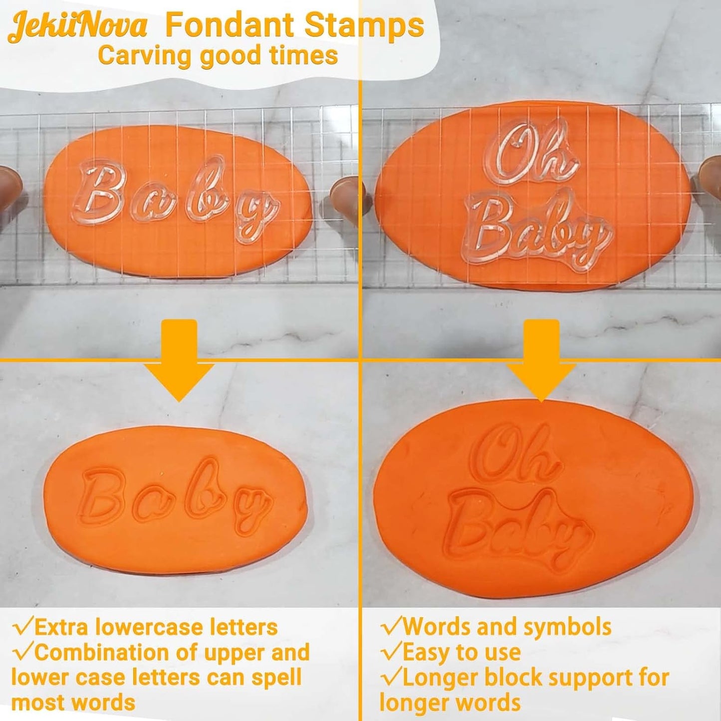 - √GREAT VALUE 4 PCS FONDANT STAMPS SET: JekiiNova fondant stamp set contains 3 pieces of food-grade silicone removable clear letter stamps, one uppercase and one lowercase(including 2 of a,e,i,o,p,s,u, and 3 of y), another contains common phrases and symbols, and a clear acrylic block for layout, with grid lines drawn on the block, all accessories have no sharp edges and are unbreakable, so you can rest assured that your family will enjoy baking together.
