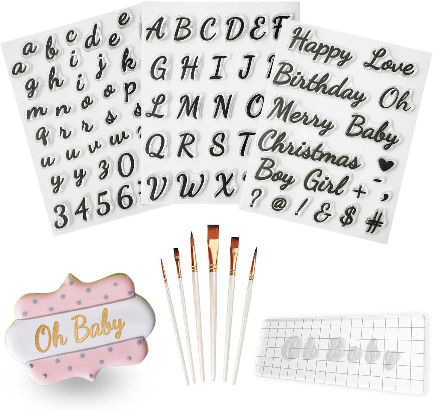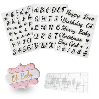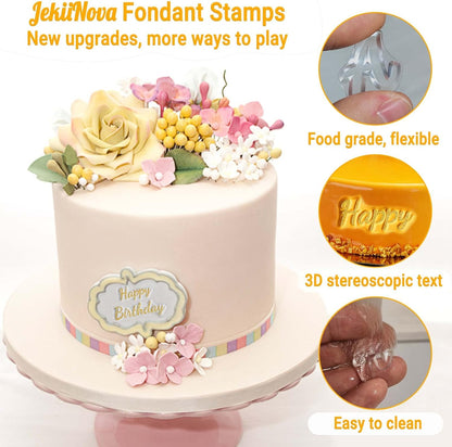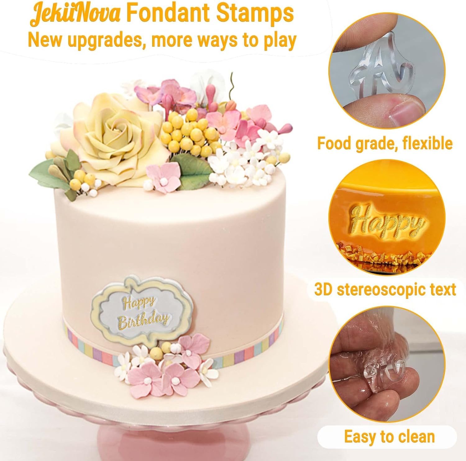 - √GREAT VALUE 4 PCS FONDANT STAMPS SET: JekiiNova fondant stamp set contains 3 pieces of food-grade silicone removable clear letter stamps, one uppercase and one lowercase(including 2 of a,e,i,o,p,s,u, and 3 of y), another contains common phrases and symbols, and a clear acrylic block for layout, with grid lines drawn on the block, all accessories have no sharp edges and are unbreakable, so you can rest assured that your family will enjoy baking together.