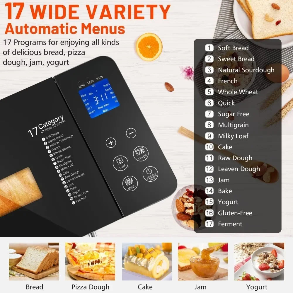 710W dual heater, 17 in 1 bread maker stainless steel, bread maker with automatic nut dispenser and ceramic plate