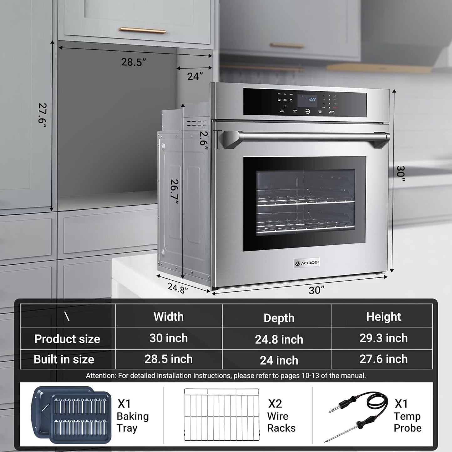 - 【Space-saving Design】 AAOBOSI electric single wall ovens offer a sleek, built-in design to fit seamlessly into your kitchen cabinetry, providing the functionality of an oven without taking up too much room and creating a cohesive and modern look. This is particularly beneficial for smaller kitchens or for those looking to create an open, uncluttered cooking environment.