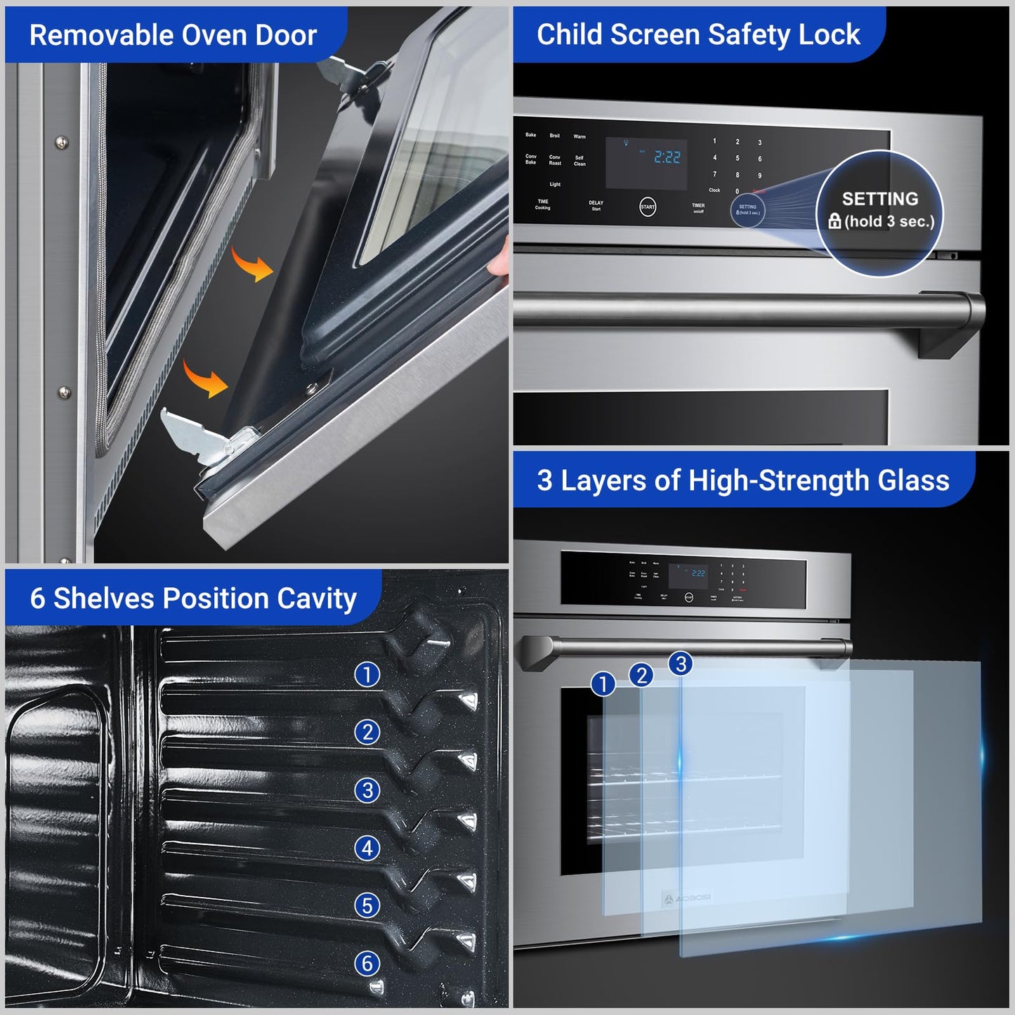 - 【Even Cooking Performance】AAOBOSI single wall ovens come with rated power of 3800W and are equipped with heating elements and a rear convection fan, allowing for 360° hot air circulation inside the electric oven to ensure even heat distribution for consistent cooking results. This means that whether you're baking a cake or roasting a turkey, you can trust your oven to cook your food evenly and thoroughly. Note: Large items in transit may have collision problems, if encountered, please contact us in a timely manner, we provide you with a satisfactory solution!