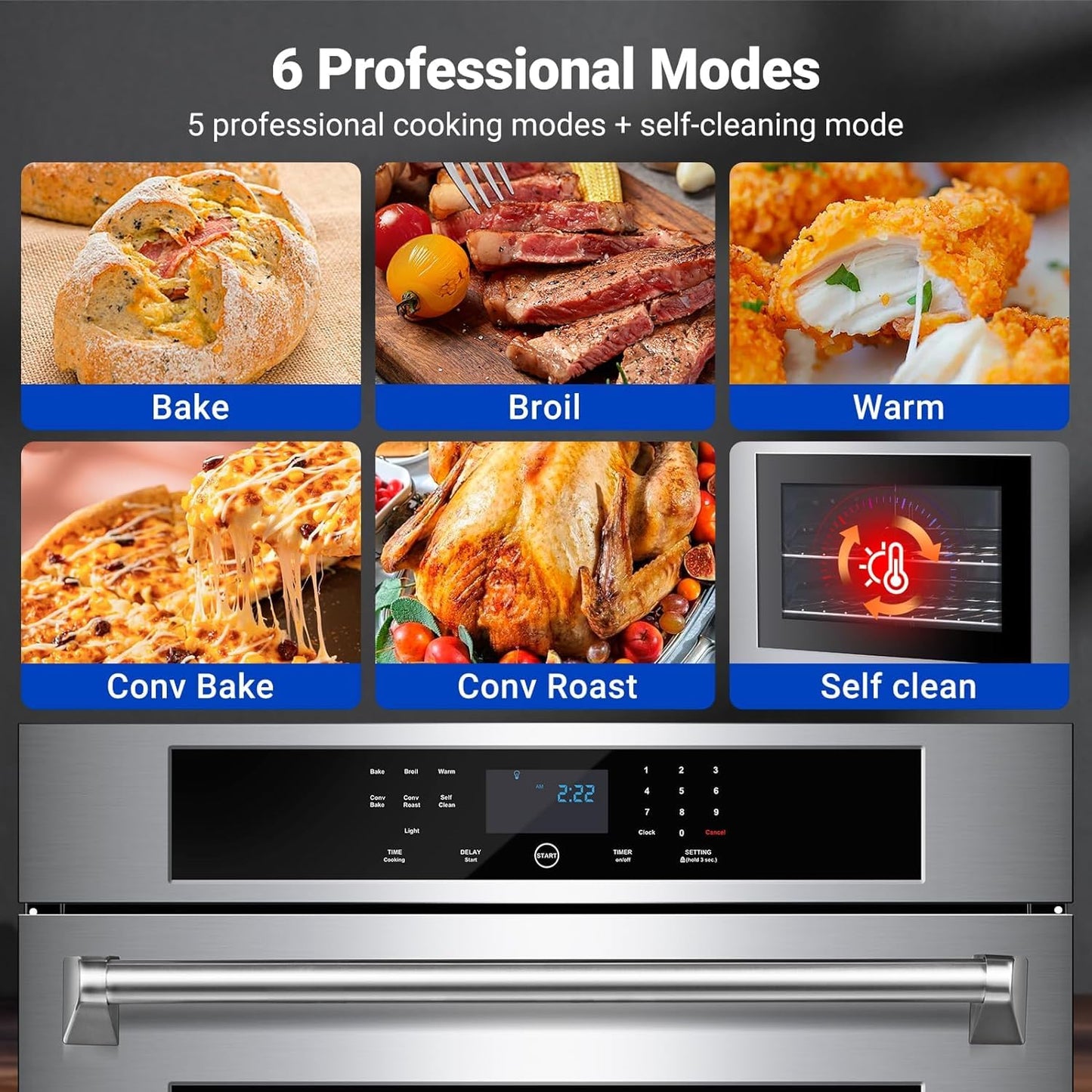 - 【Multiple Auto Modes for Quick Start】AAOBOSI wall oven features intuitive controls and touchscreen displays, making it easy to set the temperature, timer, and a range of preset cooking modes such as bake, broil, warm, convection bake, and convection roast to make cooking more accessible and efficient. The hornos eléctricos de cocina servers as a cook helper for rookie to prepare delicacies for his/her family or loved ones.