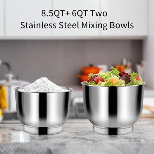 - 【8.5QT+ 6QT Two Stainless Steel Mixing Bowls】This mixers kitchen electric stand mixer equipped with two food grade stainless steel bowls,which perfect for a variety of mixing and baking needs. Special Nesting design for nest two bowls together and offer space-efficient storage.It's a good helper for food prep, washing vegetable and storing, or rough mixing, like salad.