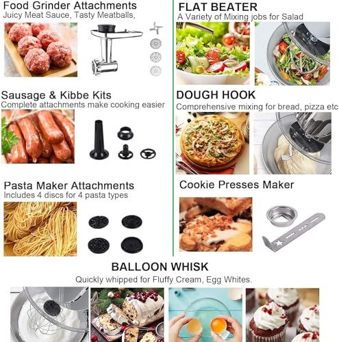- 【7-in-1 Multifunctional Stand Mixer】Aifeel mixers kitchen electric stand mixer comes with meat grinder, dough hook, whisk, beater, pasta roller, sausage kit, cookie presses etc. kitchen electric stand mixer will be your perfect kitchen machine for making cakes, breads, cookies, pastry, meat sauce and more. Also with splash guard helps add ingredients without making a mess.