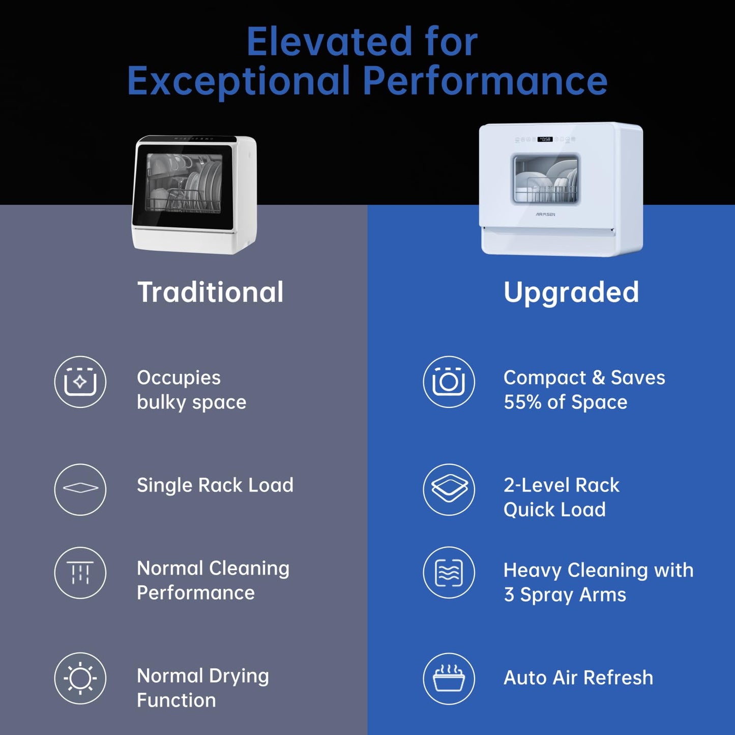 - UPGRADED SPRAY ARMS -- Unlike traditional dual-arm designs, The table dishwasher is equipped with 3 high-pressure spray arms, increasing water jets for more comprehensive coverage, ensuring every corner is thoroughly cleaned, reducing blind spots, and resulting in more even and thorough dishware cleaning.