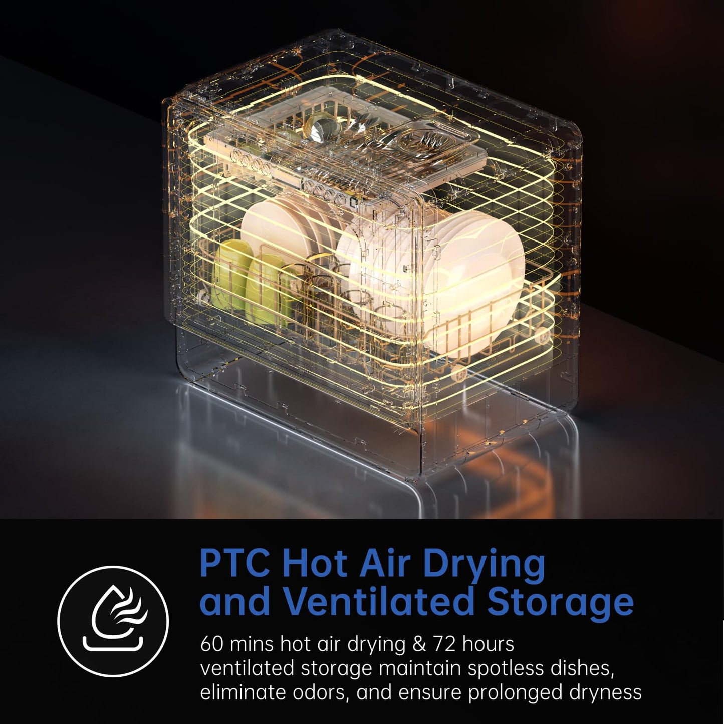 - RECYCLED HEAT SYSTEM : The efficient heating system heats both the cleaning water and tank water simultaneously, reaching up to 167°F. The generated steam helps heat the interior of the tabletop dishwasher, enabling heat energy recycling and saving additional energy, while deeply cleaning baby bottles, toys, and heavily soiled dishware, leaving glassware sparkling.