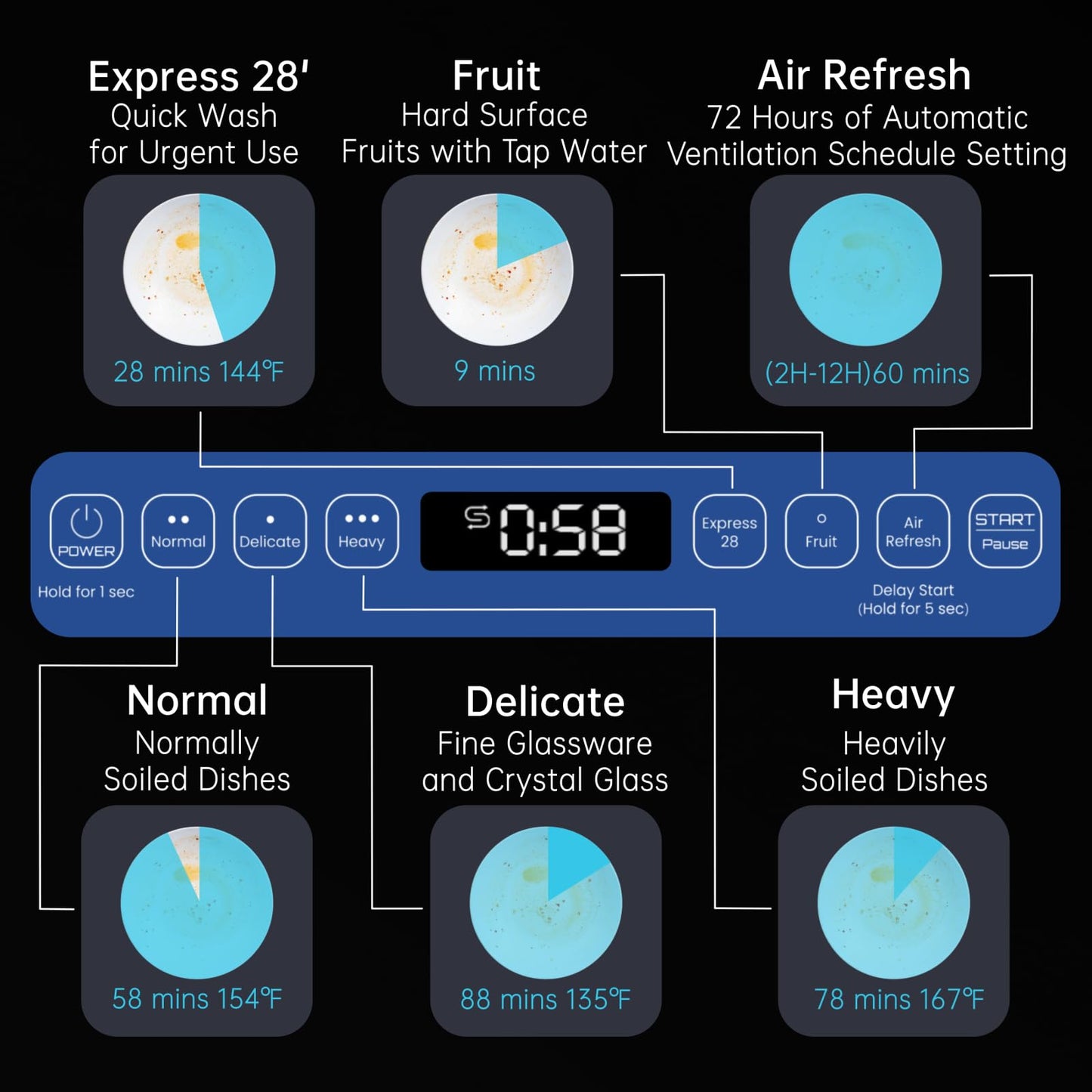 - 6 UPGRADED WASHING PROGRAM : Baby Care(~167℉, 98min), Delicate(~135℉, 88min), Heavy(~167℉, 78min), Normal(~154℉, 78min), Express(~144℉, 28min), and Fruit (9min) modes alternate 3 to 4 cycles of cold and hot water. The Delicate mode is energy-efficient and provides better care for delicate dishware.