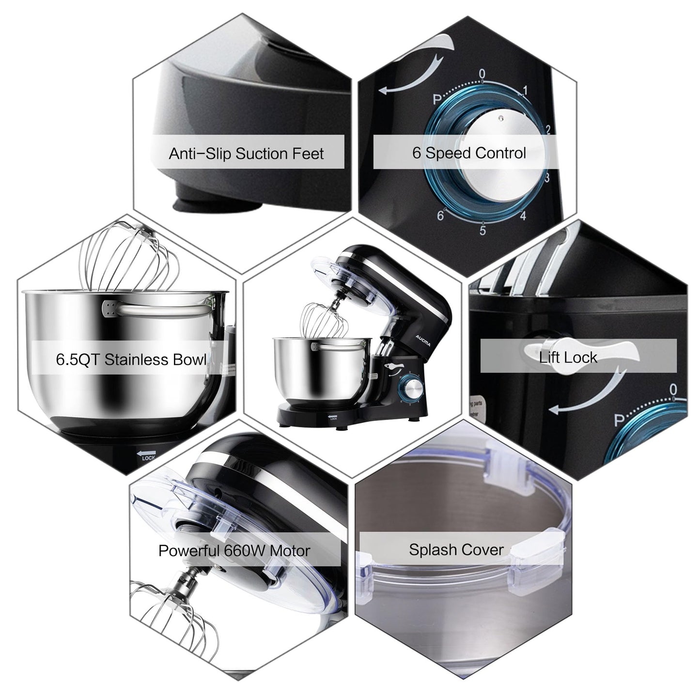Aucma Stand Mixer,6.5-QT 660W 6-Speed Tilt-Head Food Mixer, Kitchen Electric Mixer with Dough Hook, Wire Whip & Beater (6.5QT, Black)
