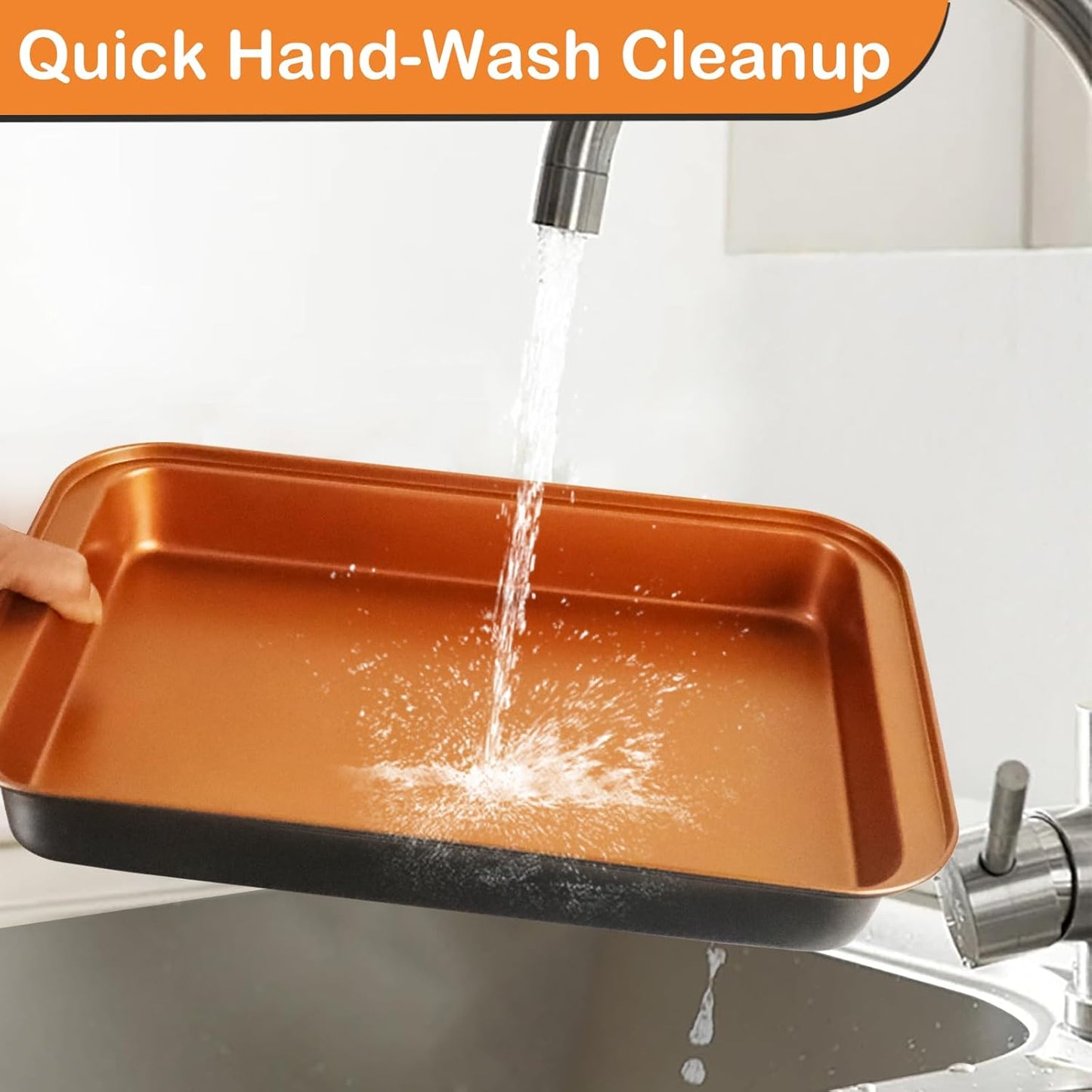 - Toaster Oven Bakeware Set Temps up to 446℉: The stackable baking pan set nonstick is oven safe up to 446℉, perfect small size for most family oven, stackable design, saving space for cabinet, kitchen, RV and convenient to store the baking sheet set