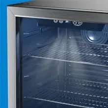 - BEST IN GLASS BEVERAGE COOLER - This 3.2 cubic feet freestanding beverage refrigerator features a reinforced and insulated clear glass front door to keep drinks cold, secured by a matte silver stainless steel frame. Its white LED interior light illuminates soda or beer cans, wine bottles and more, making your favorite chilled drinks look better and brighter