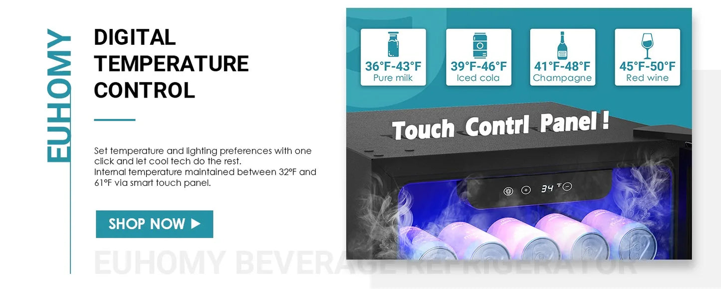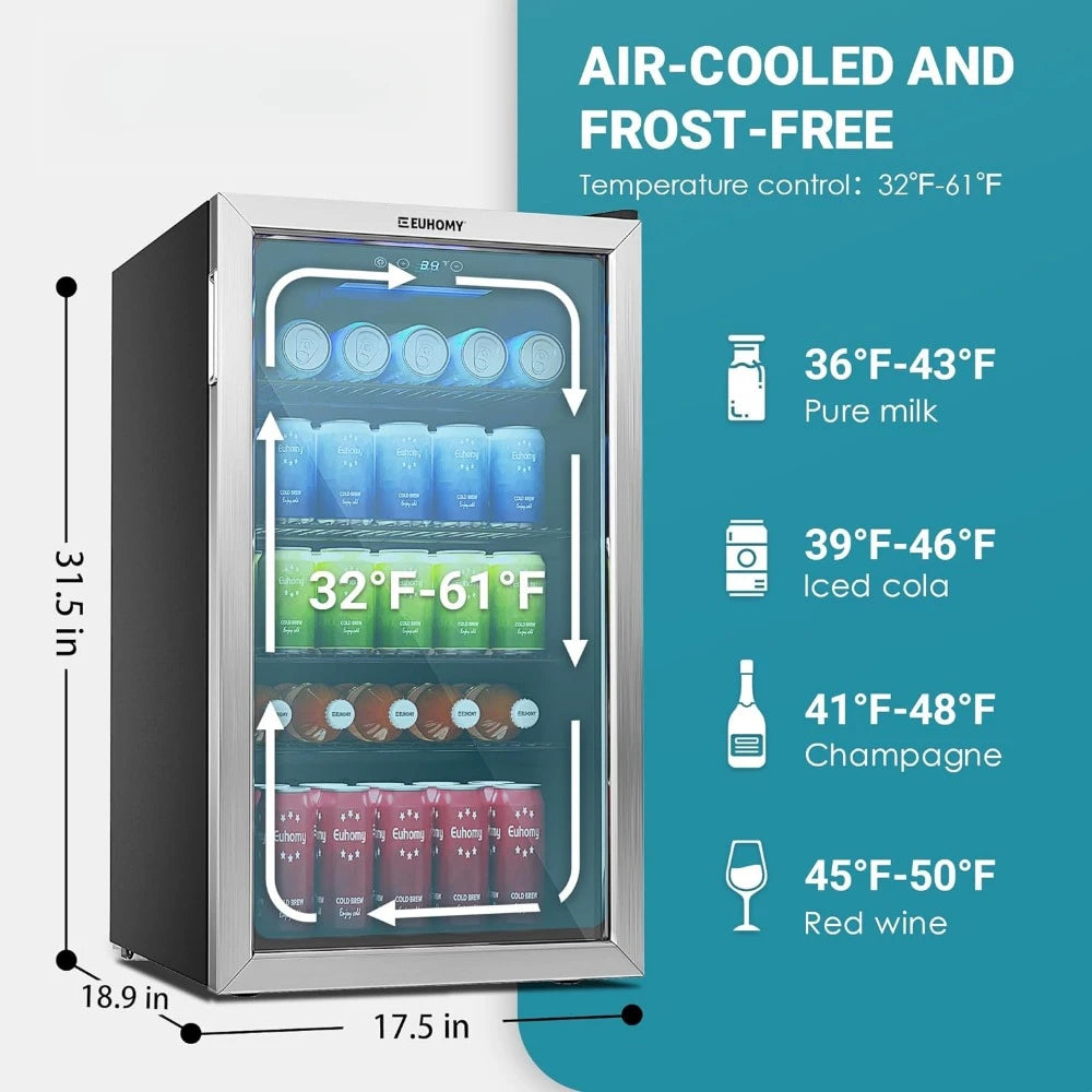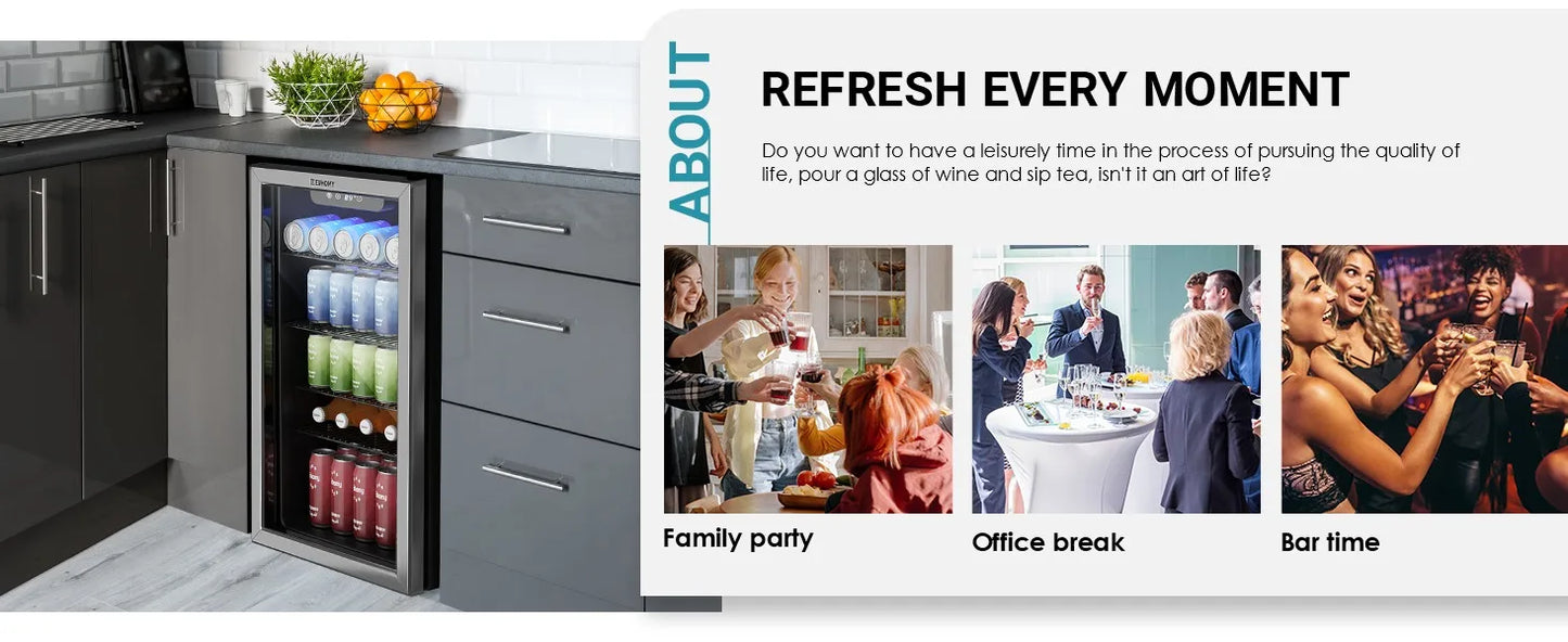 - QUIET + ADVANCED COOLING SYSTEM - With a powerful compressor and internal air-cooled system, mini fridge creates an evenly cooled space by ensuring that air flows throughout the entire beverage center.In addition, ultra quiet cooler of beverage cooling machine doesn't affect your daily rest or working. With our cooler, you won't just enjoy cold drinks, you'll have a quiet environment too.