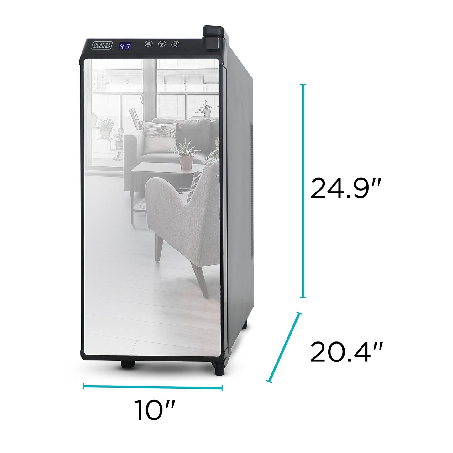 - 12 BOTTLE STORAGE: Store up to 12bottles of your favorite vino with this 28.3-lb. space-saving wine cellar. Our BLACK+DECKER wine fridge (10” x 20.4” x 24.9”) also includes 5 full-length chrome removable racks and convenient interior light.