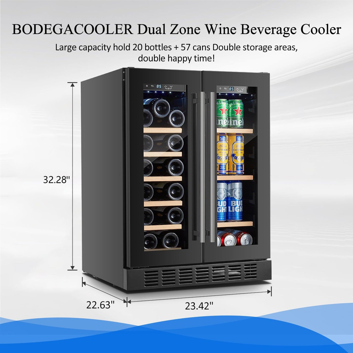 BODEGACOOLER 24 Inch Wine and Beverage Refrigerator, 2 Door Commercial Back Bar Cooler, Dual Zone Wine Cooler Refrigerator, Back Bar fridge for bar, party, Hold 20 Bottles and 57 Cans,LED light,Black.
