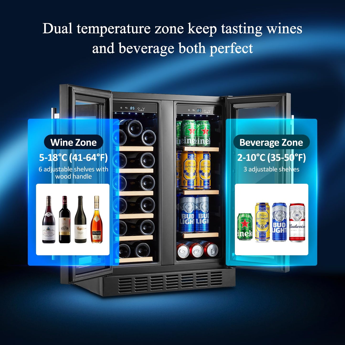 - 🍷【Dual Zone Wine Cooler】 Wine and beverage refrigerator 24 Inch just meet your both needs to cool your wine collections and as 2 door commercial back bar cooler same time! Dual zone temperature control,make wine and beverage best flavor for happy party time! 24 Inch dual zone wine cooler refrigerator freestanding also can be installed under counter.This 2 door back bar fridge is perfect for bar,club,lounge,private wine collection,winery.
