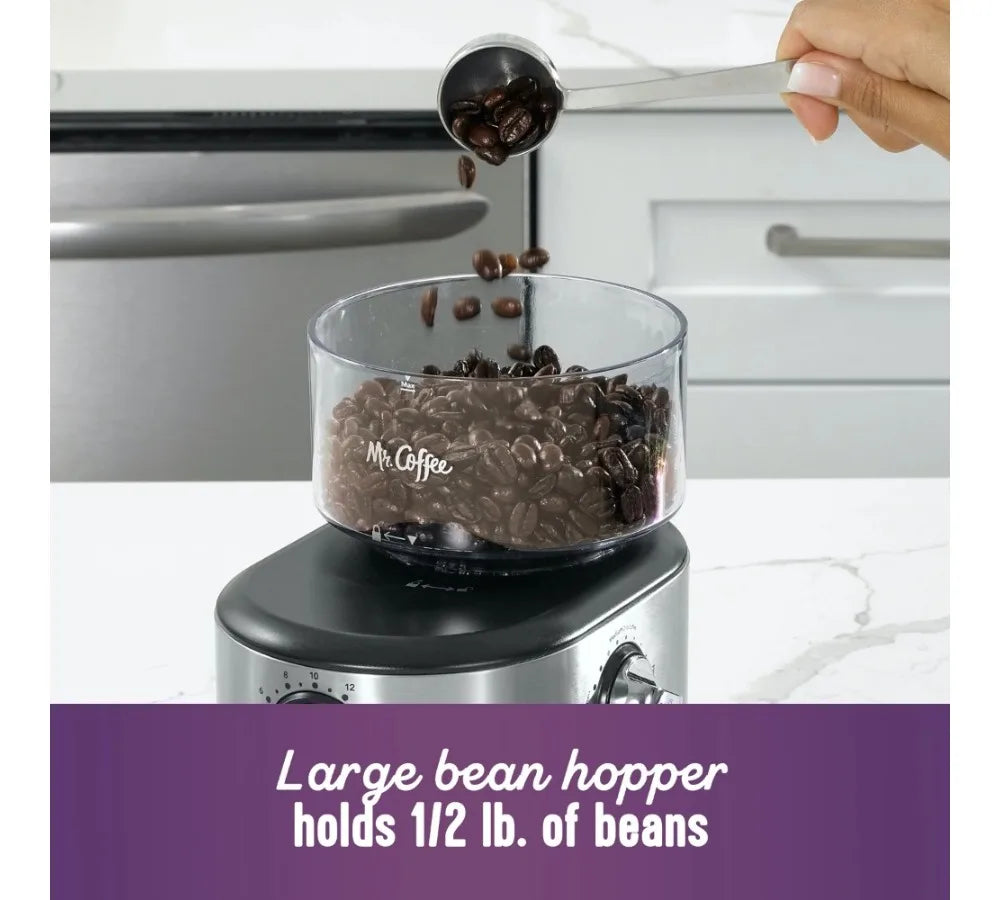 True coffee lovers know that freshly ground coffee beans always make the best tasting coffee. The Cafe Grind 18-Cup Automatic Burr Grinder is designed to do just that-with one simple touch. The Cafe Grind coffee grinder easily grinds whole coffee beans to yield consistent, flavorful coffee grounds for making regular coffee, espresso, cappuccinos, lattes, mochas, and all your other favorite coffee beverages. Burr grinders are considered to be the best method for grinding whole coffee beans, as they use flat, precise plates rather than blades to grind the beans more uniformly. This burr grinder features 18 cup settings and 18 grind settings. Depending on the grind setting you select, the machine can make several consistencies, ranging from coarse to fine, that allow you to prepare coffee in a drip machine, espresso maker, French press, pour over, and more. Once grinding is complete, the burr coffee grinder shuts off automatically for greater safety. The included bean hopper holds up to a 1/2 lb. of coffee beans, and like the grind chamber, removes for easy cleaning. With its elegant stainless steel finish, this coffee grinding machine integrates easily into any decor.