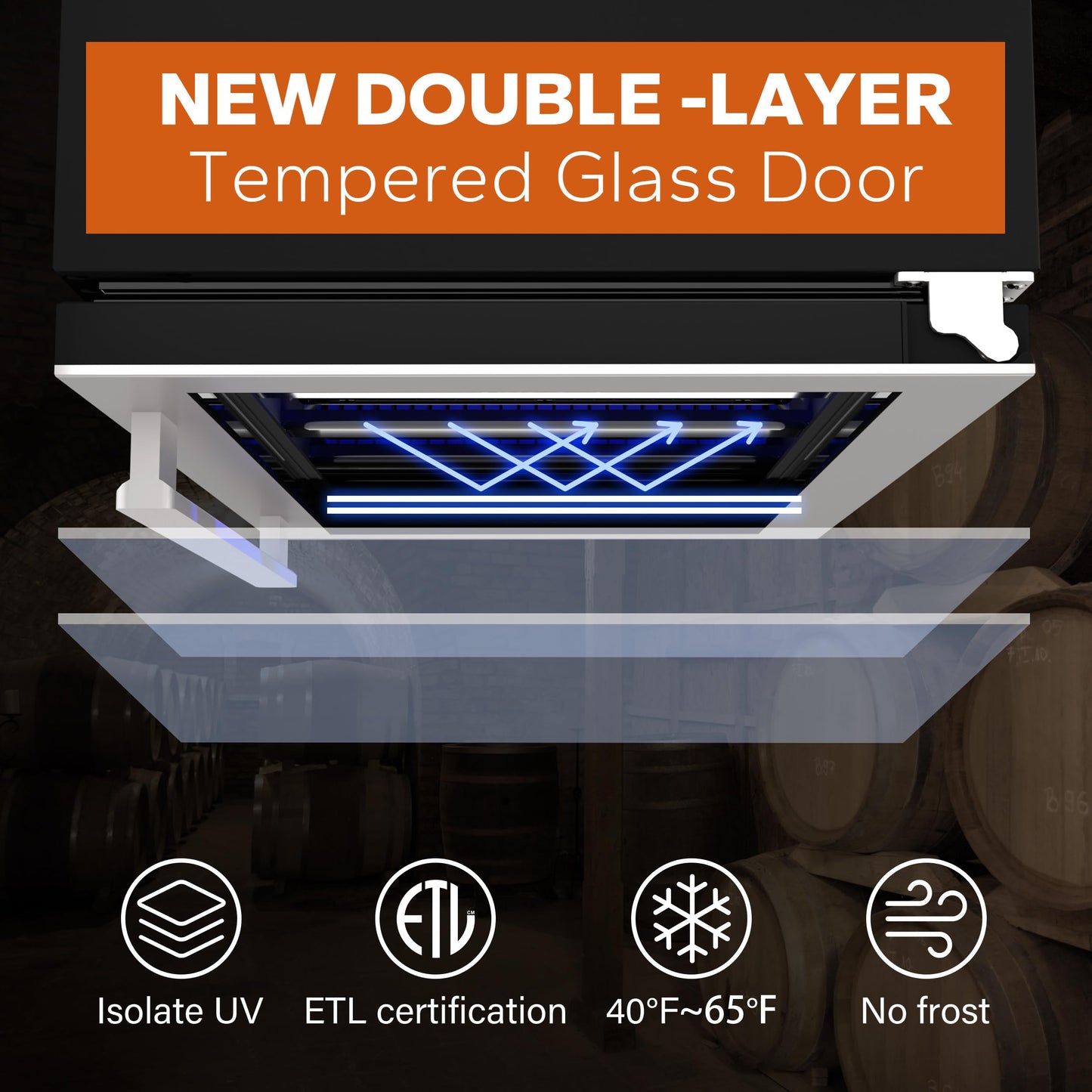 - 【Dual-Layer Glass Door】The dual-layer tempered glass door blocks harmful UV rays, protecting your wine from light damage, oxidation, and flavor loss. The stylish design also provides an extra layer of protection, enhancing wine preservation.